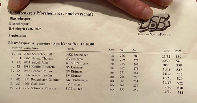 Zwei Mannschaften des SV Eisingen nahmen an der Kreismeisterschaft 2026 im Blasrohrschießen teil. Der Wettbewerb fand wie auch schon 2025 beim KKS Brötzingen statt. Hier eine paar Impressionen des Wettkampfs
